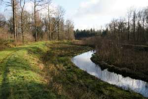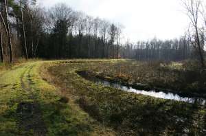Helaas zien we er weinig van. Grote borden met "eigen weg" en "verboden toegang" zorgen ervoor dat we dit gebied niet kunnen betreden. We genieten daarom van het uitzicht naar de andere kant. We komen een beek die we een heel stuk gaan volgen. Het gebied laat weidse uitzichten zien. Om hier te komen moeten we een klein stukje "off-road". Het pad dat er zou moeten liggen bestaat niet meer. Omdat het over een kleine 100 meter gaat zijn we maar door het bos gestruind. Doet u dat liever niet dan moet u de verharde weg een klein stukje volgen tot aan de brug waarna u langs de beek kunt gaan lopen.