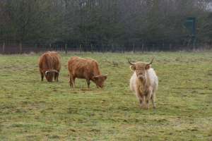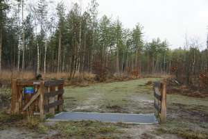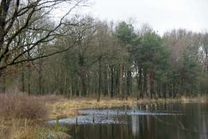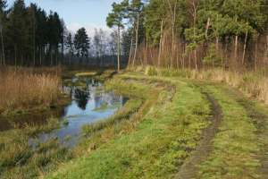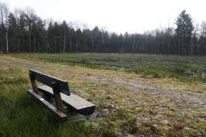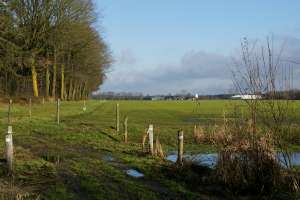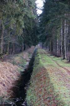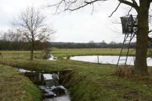 Helaas zien we er weinig van. Grote borden met "eigen weg" en "verboden toegang" zorgen ervoor dat we dit gebied niet kunnen betreden. We genieten daarom van het uitzicht naar de andere kant. We komen een beek die we een heel stuk gaan volgen. Het gebied laat weidse uitzichten zien. Om hier te komen moeten we een klein stukje "off-road". Het pad dat er zou moeten liggen bestaat niet meer. Omdat het over een kleine 100 meter gaat zijn we maar door het bos gestruind. Doet u dat liever niet dan moet u de verharde weg een klein stukje volgen tot aan de brug waarna u langs de beek kunt gaan lopen.