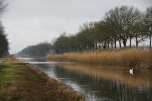 We lopen rustig langs de Noordervaart, aan de andere kant van het water ligt de drukke N275. Een mooie rietkraag zorgt ervoor dat we weinig verkeer zien.