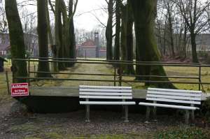We lopen weer een stukje langs de Noordervaart. Het pad dat we eigenlijk in gedachte hadden bleek "eigen weg" te zijn en afgesloten met een stevig prikkeldraad. Dan zien we een paar bankjes met een soort bruggetje erachter. Het rode bord met Duitse tekst valt direct op. We zijn bij vormalige klooster Stokershorst.
